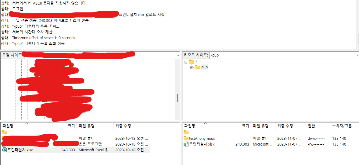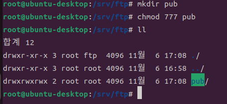 - 일반적으로 ftp 폴더 내 공용폴더 pub를 만들어 권한을 부여한다. 게스트는 해당 폴더에서 읽고 쓰기를 할 수 있다.