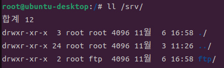 - 익명의 사용자가 접속하는 경로는 /srv/ftp/이다 권한을 보면 755로 게스트는 쓰기 권한이 없다.