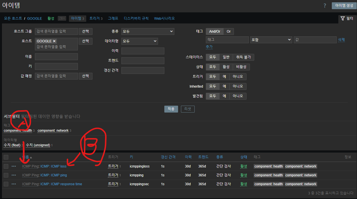 - 호스트의 `아이템` 클릭 ICMP Ping 템플릿에 의해 생성된 아이템 확인