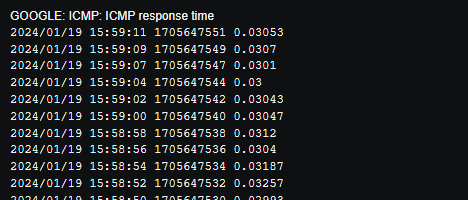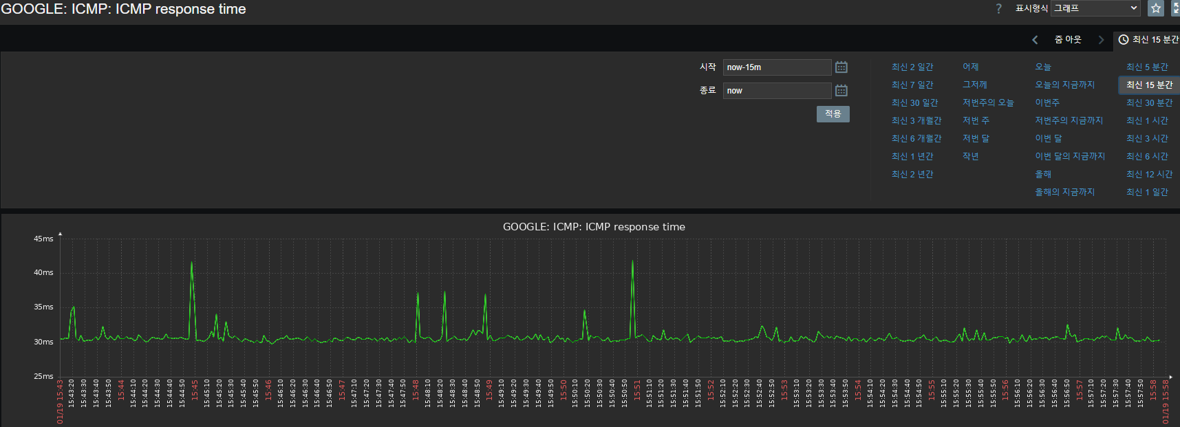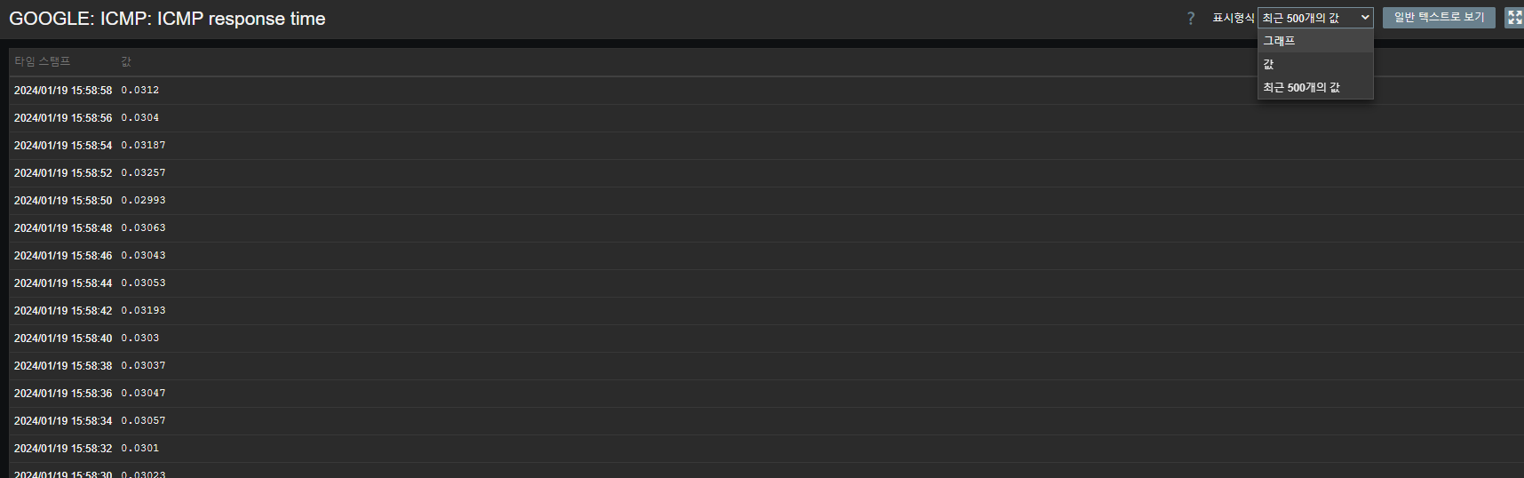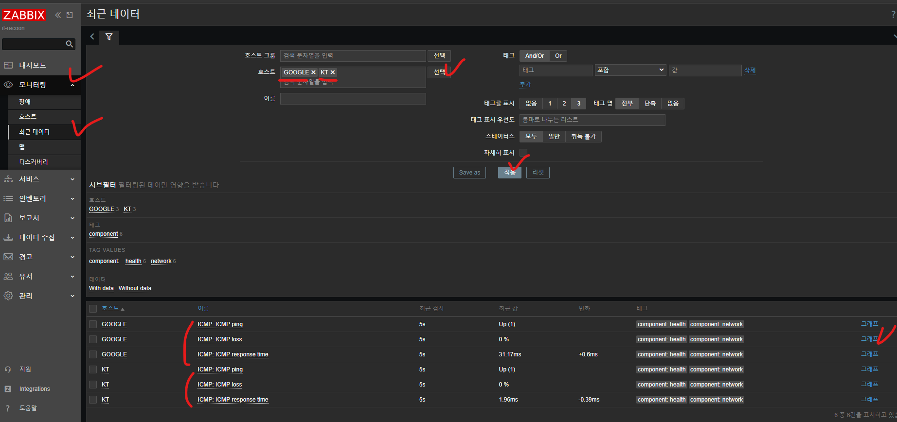 - `메뉴 - 모니터링 - 최근 데이터` 클릭, 필터 설정 후 데이터 확인, ICMP response time `그래프` 클릭