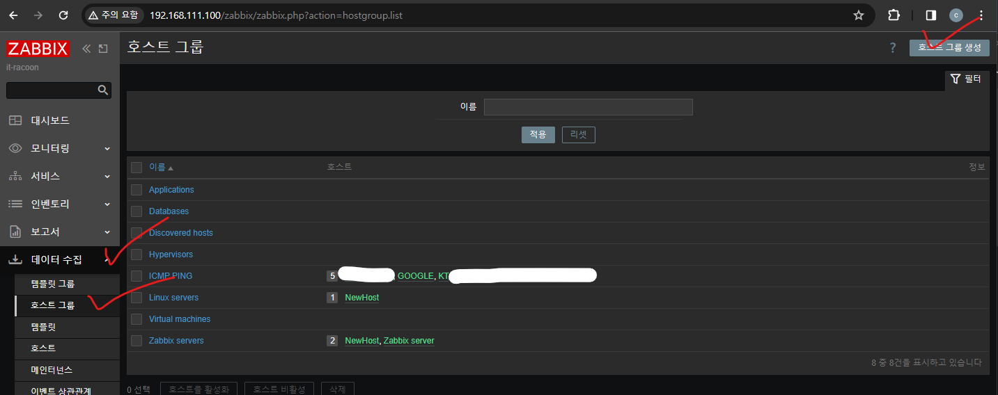 - `메뉴 - 데이터수집 - 호스트그룹 - 호스트 그룹 생성` 클릭