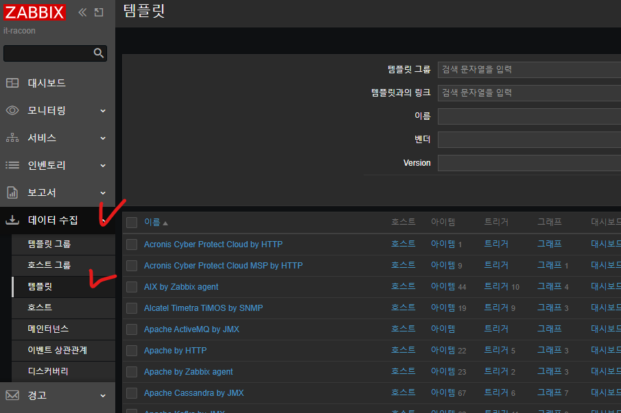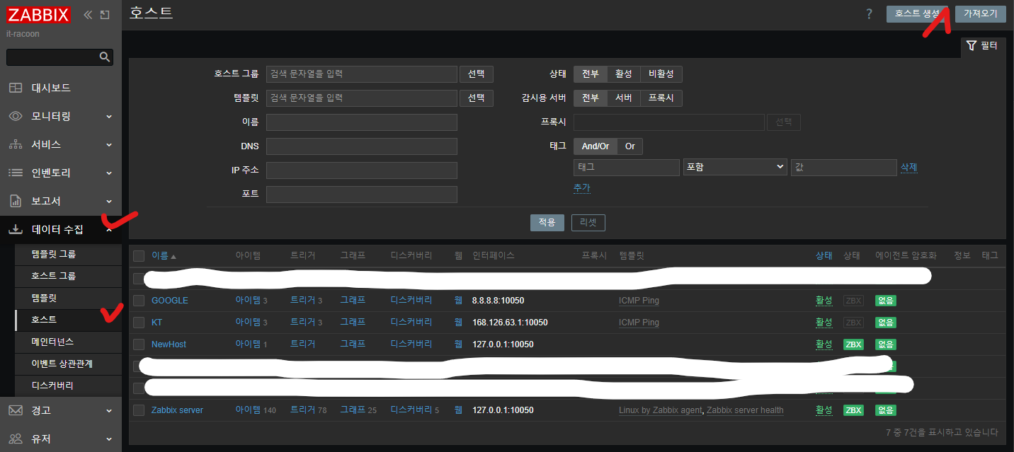 - Zabbix 서버에서 감시할 호스트 및 모니터링할 아이템 설정