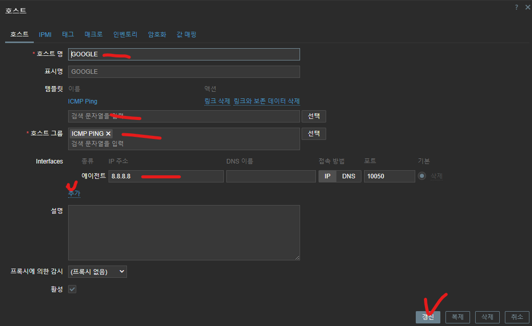 - 호스트 그룹 ICMP PING 추가 (이름은 자유롭게 입력)