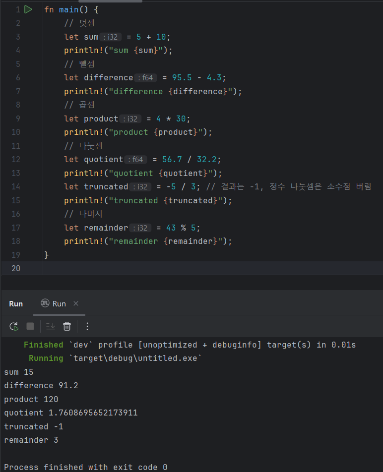 - Rust는 모든 숫자 타입에 대해 기본적인 수학 연산을 지원한다.