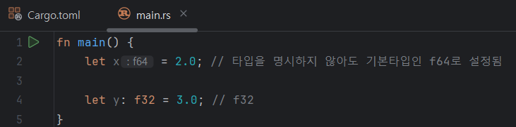 - 기본 타입은 `f64`이다. 현대 CPU에서 `f32`와 속도가 거의 같기 때문에 더 정밀한 `f64`를 사용한다.