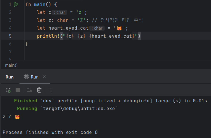 - `char` 타입은 4byte의 크기로 유니코드 스칼라 값을 나타낸다.