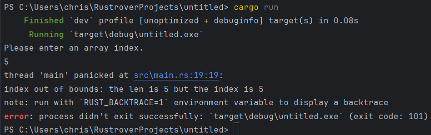 - 유효하지 않은 값을 사용하여 인덱싱 작업을 수행하는 시점에서 런타임 오류를 발생시켰습니다. 프로그램은 오류 메시지를 출력하며 즉시 종료되고 마지막 println! 문을 실행하지 않았습니다.