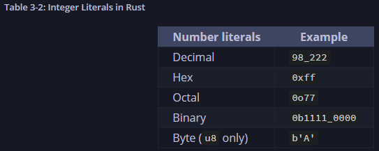 - type suffix : `57u8`처럼 타입 접미사를 붙여 타입을 지정할 수 있다.