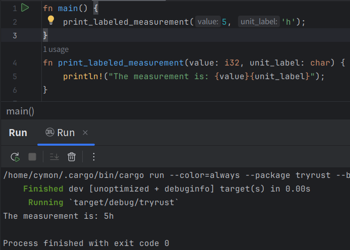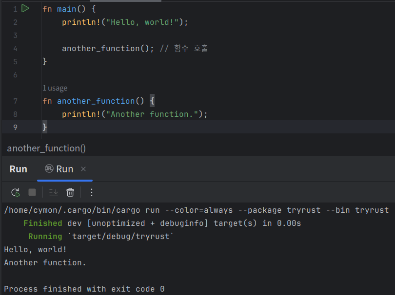 - RUST에서는 함수(변수도) 이름에 snake_case를 사용하여, 모든 문자는 소문자이고 단어는 밑줄로 구분